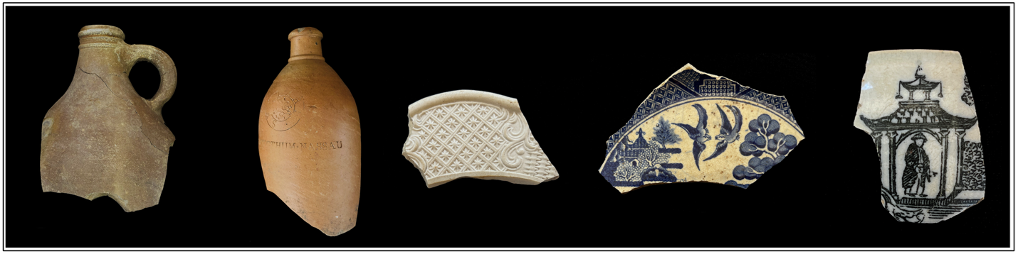 Figure 3: examples of Stoneware jug; the Nassau stoneware; white salt glazed dot- diaper- basketweave: 1685-1785, refined earthenware Willow pattern:1783-1873, Chinese porcelain: post 1820 (Samson & Ganesh, 2022, p. 67, 107).